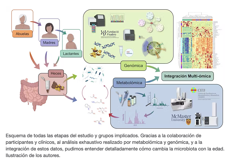 Esquema de todas las etapas del estudio y grupos implicados. Gracias a la colaboración de participantes y clínicos, al análisis exhaustivo realizado por metabolómica y genómica, y a la integración de estos datos, pudimos entender detalladamente cómo cambia la microbiota con la edad. Ilustración de los autores.